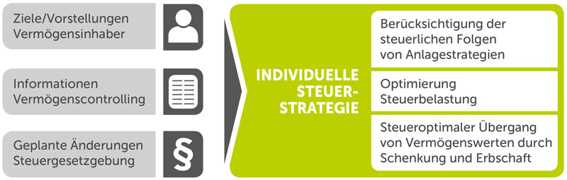 Auf Basis der Informationen des Vermögenscontrollings, Ihren Wünschen und Zielen als Vermögensinhaber und geplanten Änderungen der Steuergesetzgebung entwickeln wir für Sie eine maßgeschneiderte Steuerstrategie. Wir begleiten Sie auch bei der Umsetzung der Vermögensstrategie, z.B. bei der Auswahl, Steuerung und Kontrolle der eingesetzten Dienstleister und der Bewertung des Immoblienvermögens und der Unternehmensbeteiligungen.